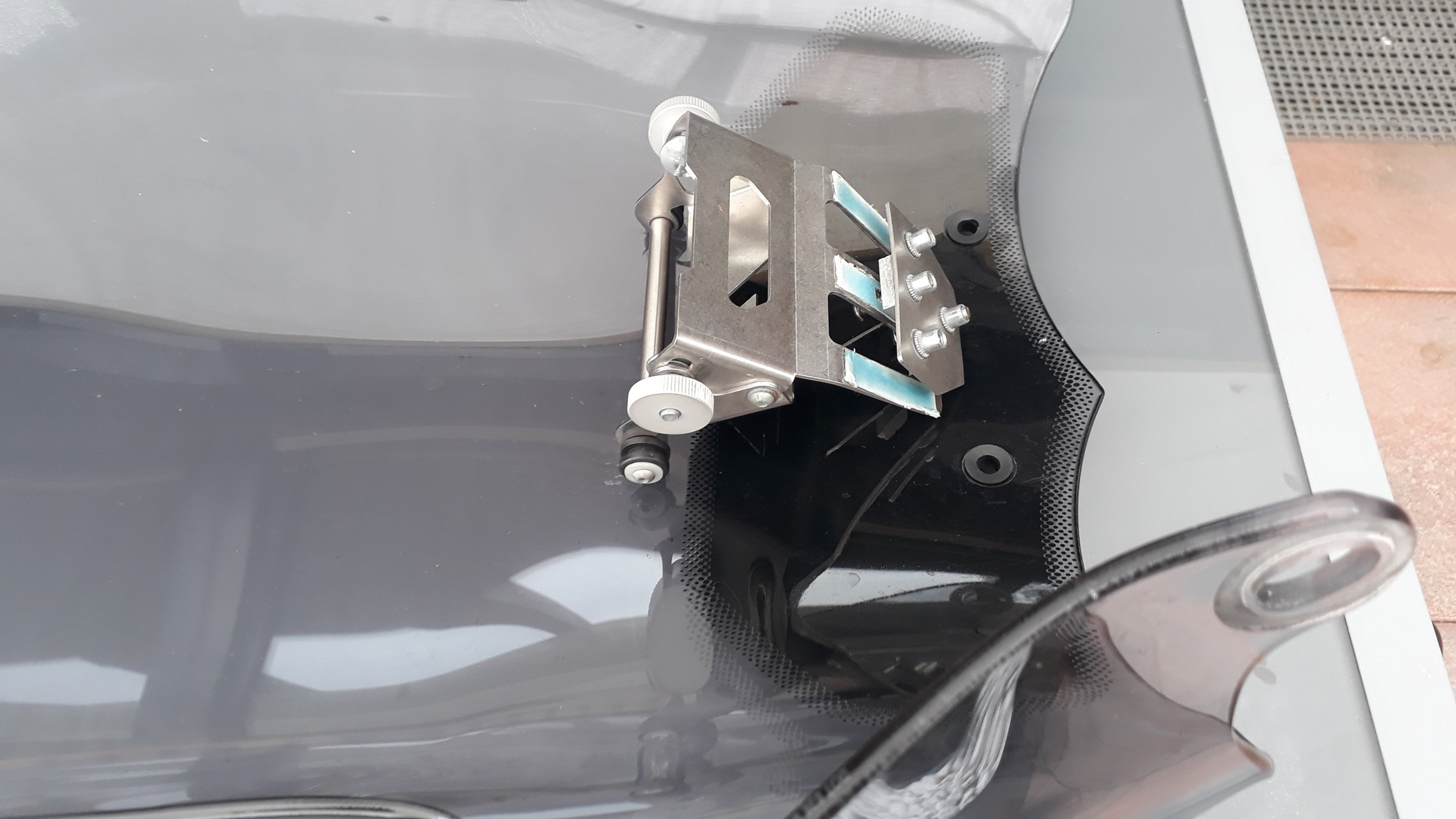 Dazu verkaufe ich eine Toratech Scheibenunterstützung, die ich mit der Scheibe montiert hatte. Die Unterstützung gibt der Scheibe ca. 10 cm höher eine zweite Abstützung. Die gibt es im Original bei Touratech nicht mehr.
