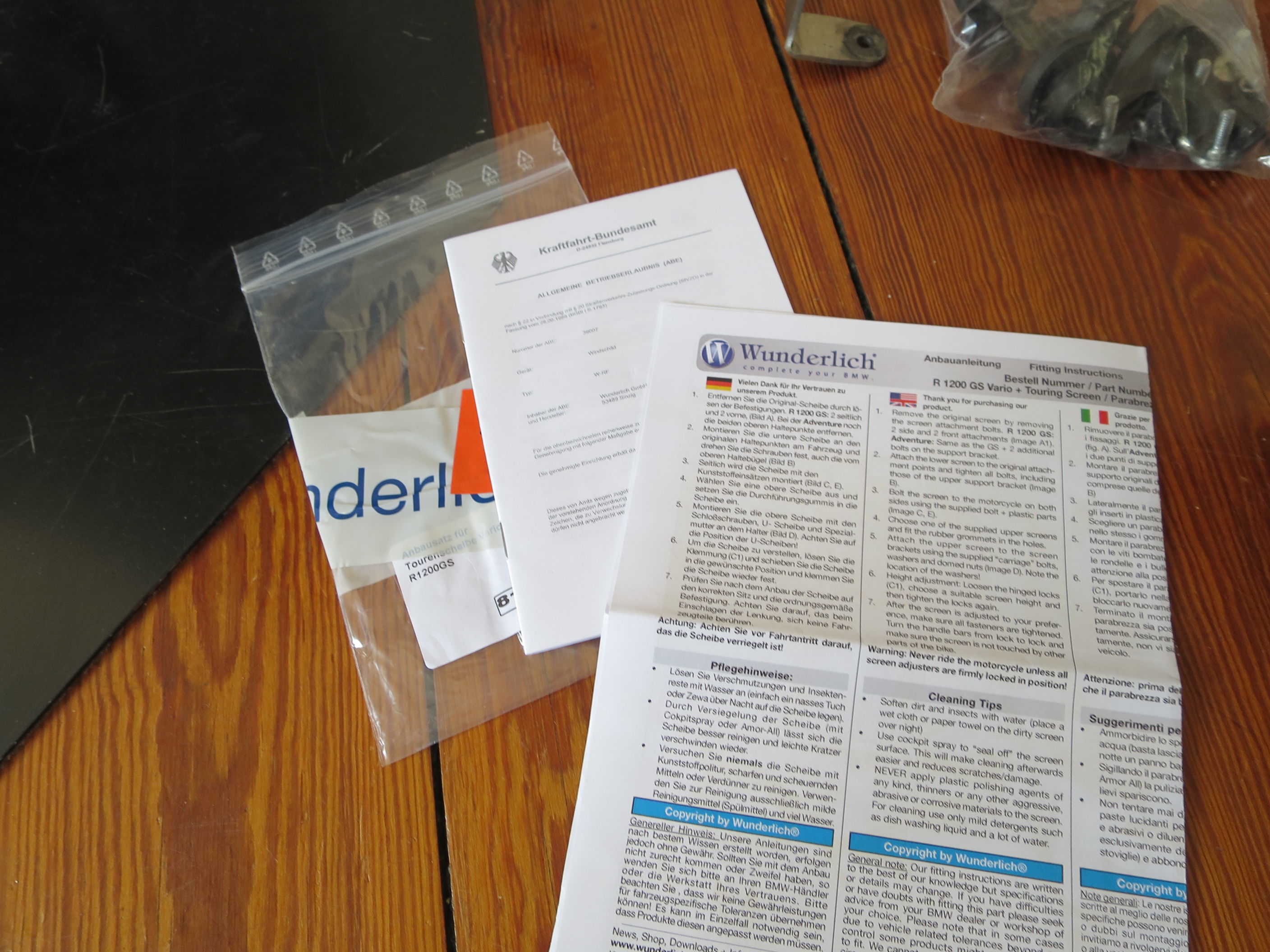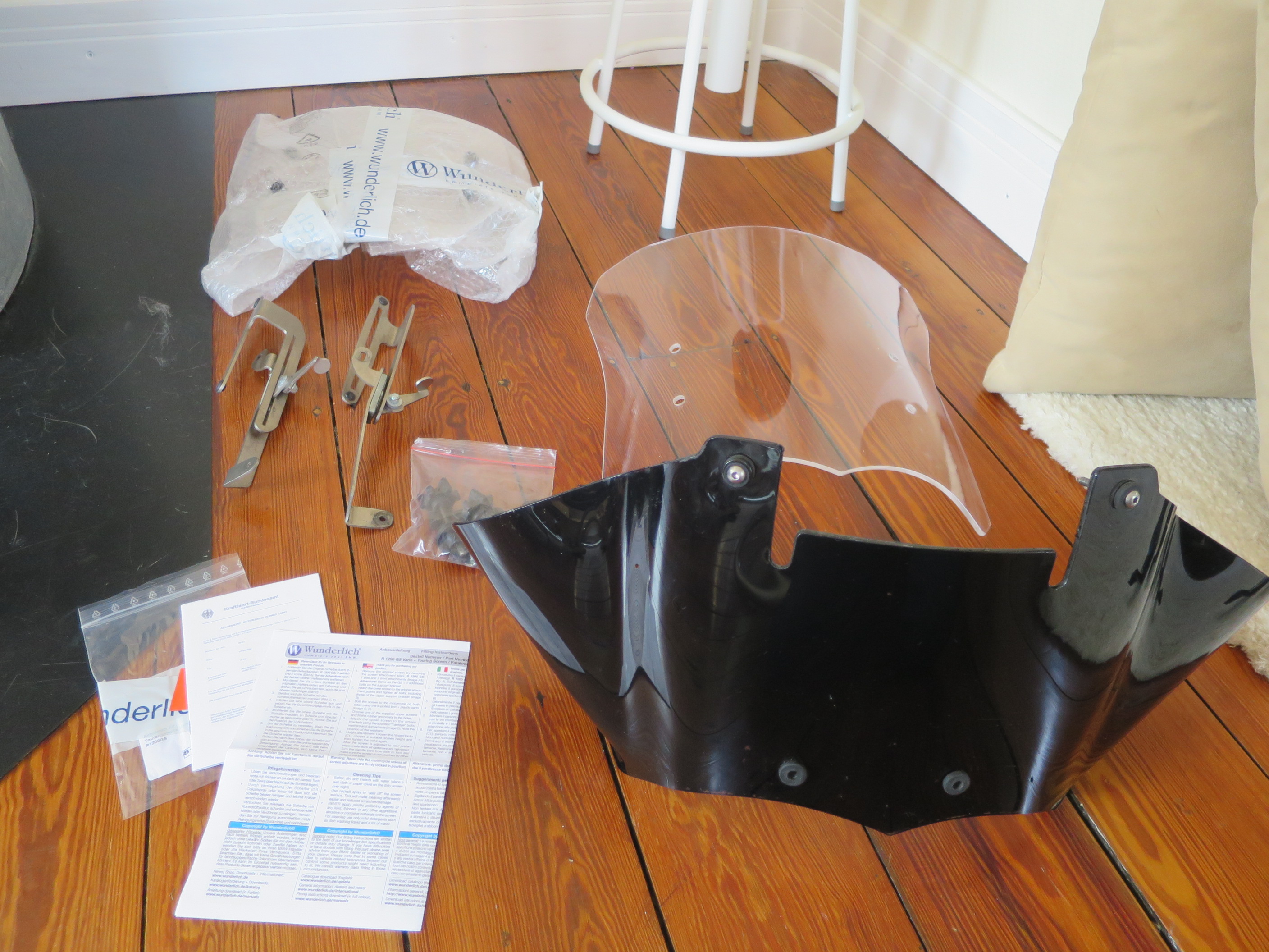 Die Scheibe lässt sich an eine R 1200 GS Adventure ab 2008-2013 problemlos montieren. Ältere Modelle kann ich nicht sagen. Bei der Standard GS müsste der obere Bügel bechafft werden. Die wichtigsten Schrauben sind dabei. Die kleine Oberscheibe wurde nicht benutzt und somit neuwertig.