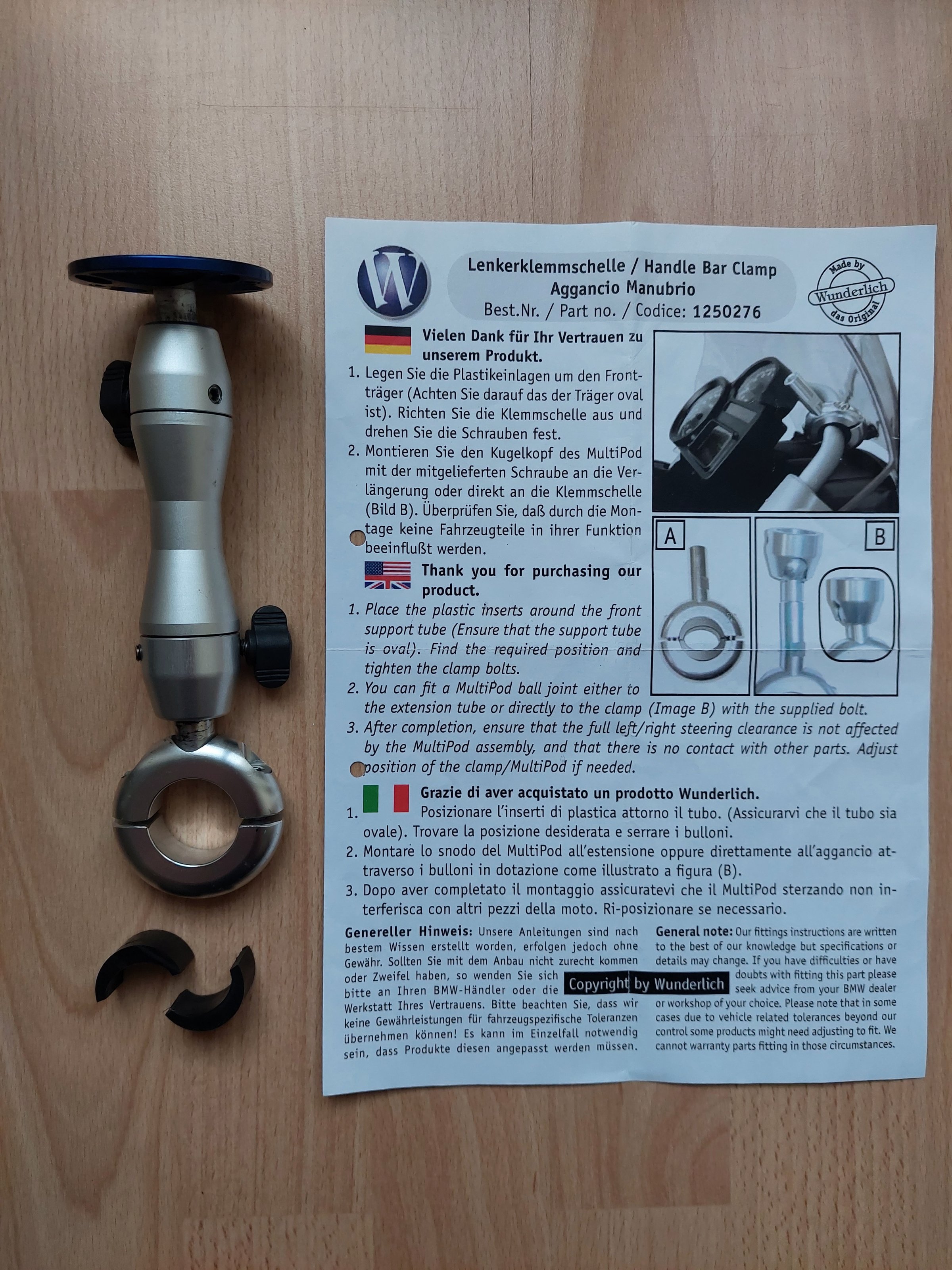 ich biete hier einen Navihalter MultiPod der Firma Wunderlich an. Das Teil war an einer 2011 BMW R 1200 GS verbaut und passte dort durch die Einlagen in der Klemmschelle perfekt an den Bügel oberhalb der Instrumente (s. Foto). Alle Gewinde sind i. O.