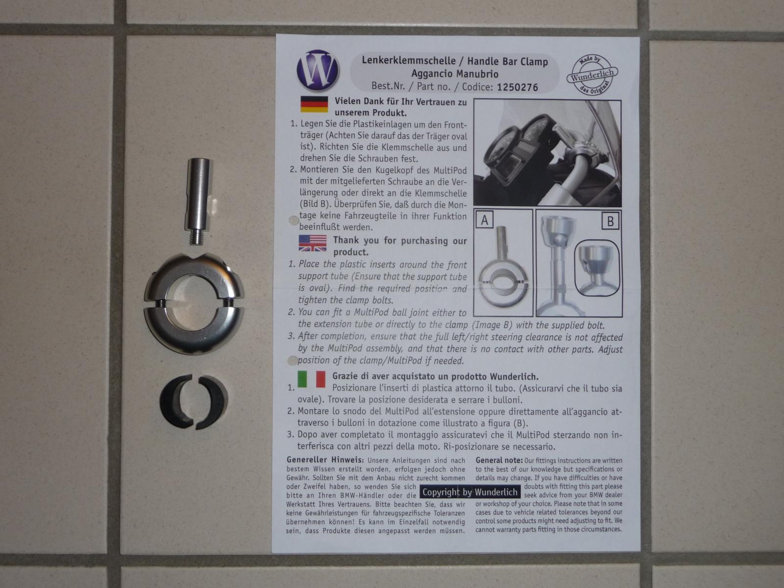 Biete ein MultiPod lang mit Trägerplatte incl. Silentblöcken der Firma Wunderlich. Dazu eine Klemmschelle zur Befestigung des MultiPods am Frontträger (Cockpit) der R 1200 GS incl. optionaler 40 mm Verlängerung.