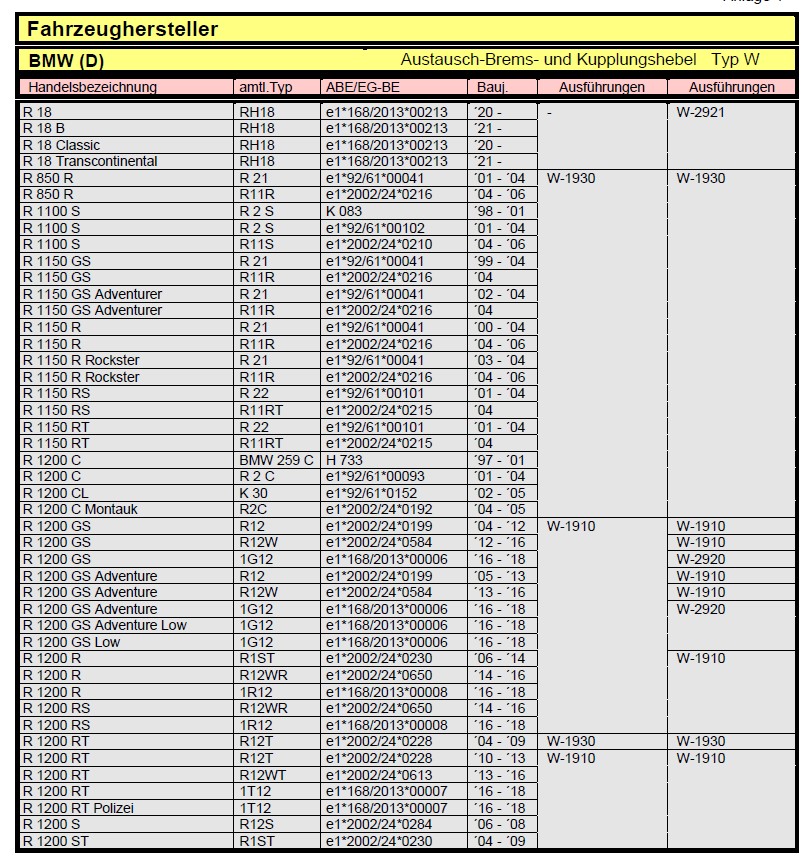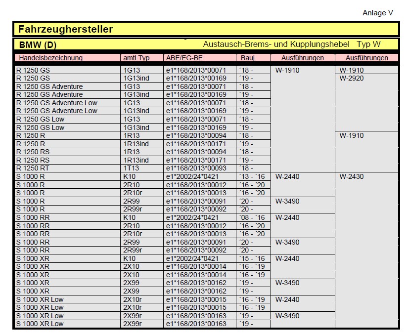 Da die ABE für mehrere BMW Motorräder gilt hier nur ein Bild mit Auszug zu W-1910