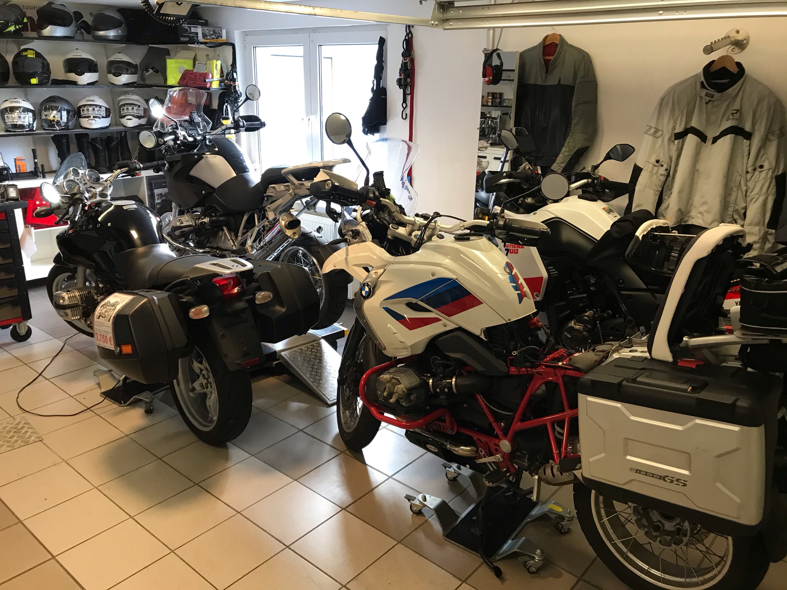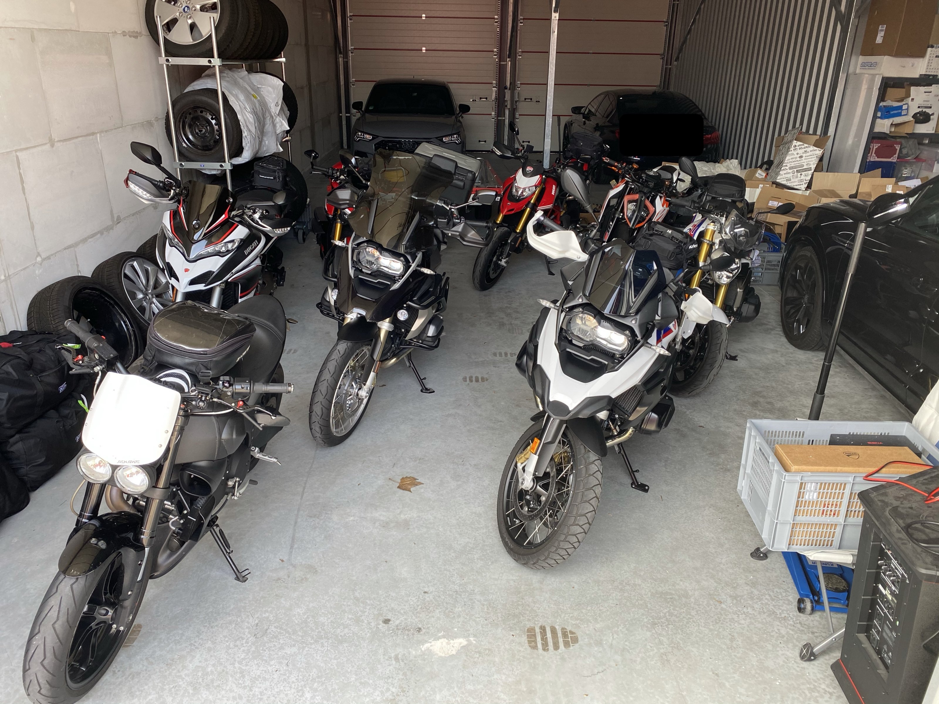 In meiner -bis auf den Trägerbereich Stehhöhe garantierende- Garage stehen vier Mopeds, ein Seitenwagen ist darüber gestapelt (Maschine drunter nicht zugelassen), zwei Kompressoren, ein Stahlschreibtisch als Werkbank, zwei Gaschromatographen, ein Headspacegerät -= Werkbankfläche blockiert, Werkzeugwagen, Regale an ca. 2/3 der Wände, zwei Scherenheber, ein hydraulischer Motorradheber, ein hydraulischer Rangier-Wagenheber, etc. … fertsch,kein Platz für irgendwas. Zum Ölwechsel (schon zum rausfahren) muss ich erstmal ausräumen.