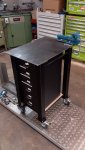 Die HebebhĂŒhne ist aus einem alten Hubtisch gebaut. Eingefahren nur 70mm Höhe womit sich das Moped ohne Probleme raufschieben lĂ€sst.