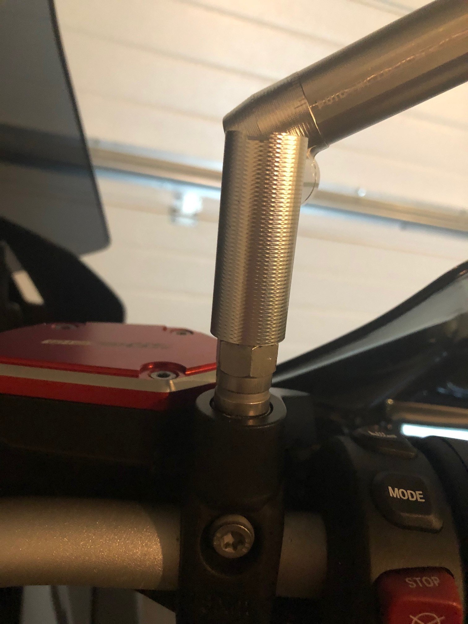 Auf vielensieht man Spiegel mit Ram Mount technik. Also zwei gugeln und dazwischen ein Ausleger.