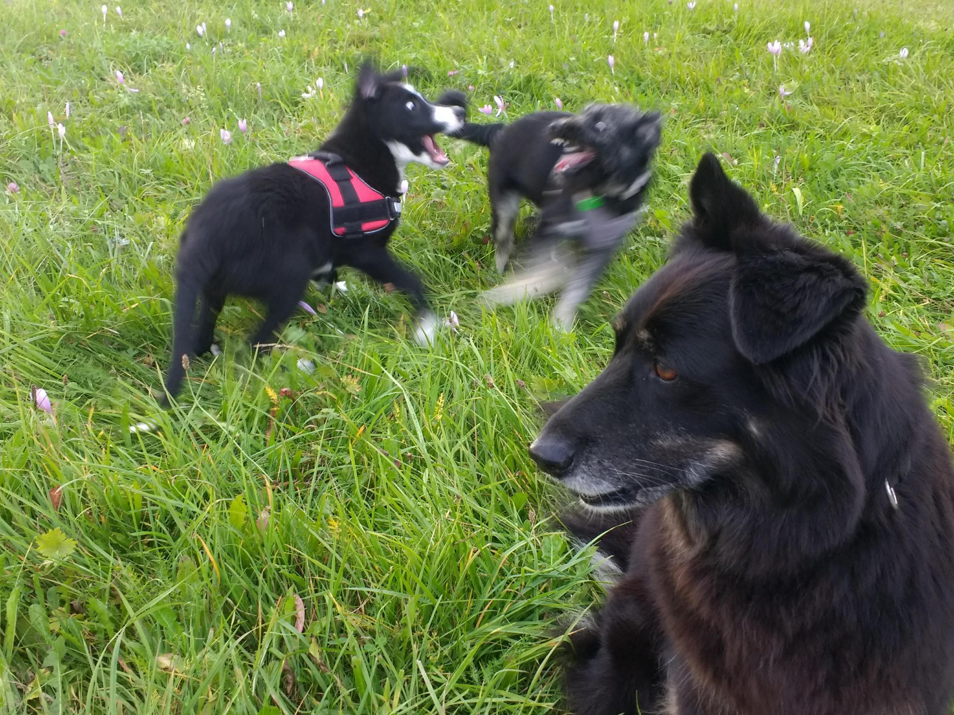 Obwohl unsere Maja mit ihren ca. 11 Jahren ein nicht wirklich ruhiger Hund ist, überlässt sie die Rauferei lieber den Welpen untereinander.