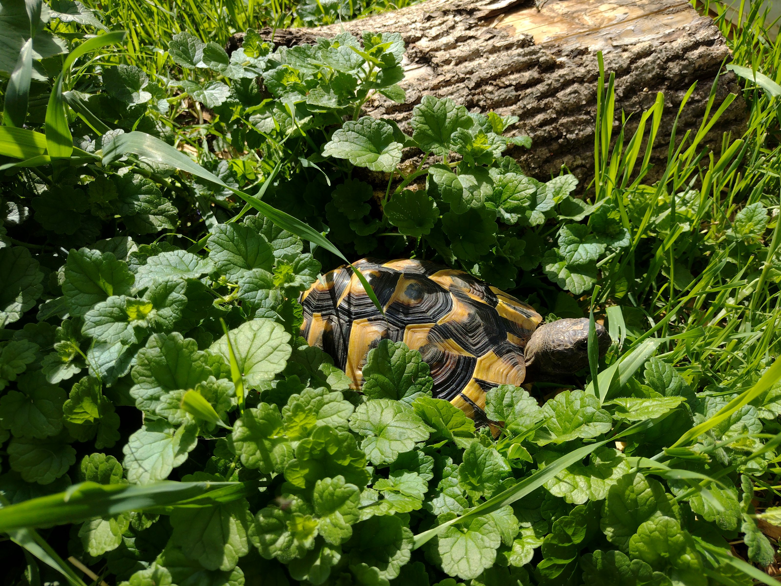Da sollte er (sie) viel u. oft sein, wenn es denn auch schattigen Unterschlupf gibt und die Temperatur ausreichend hoch ist (>18-20°C). Schildkröten sind keine faul herumliegenden Tiere und haben in Freiheit sehr große Bewegungsradien, z.T. über mehrere km/Tag. Die Gräser u. Kräuter sind allerbeste Nahrung, viel besser als häufig gefüttertes Obst u. Gemüse (Schildkröten können keinen Zucker verwerten, das führt ggfs. zu Durchfall). Zudem fördert der Aufenhalt im Sonnenlicht die richtige Panzerbildung (UV-Strahlung, muss sonst mit entsprechenden Lampen zur Verfügung gestellt werden). Zusätzl. sollte Calcium zur Verfügung gestellt werden, z.B. die abgekochten, enthäuteten Schalen der Frühstückseier (in ganzen Stücken, die nehmen die "Kröten" selbst auf u. zerkleinern sie bedarfsgerecht).Nepomuck, der eigentlich eine sie ist, wie sich erst später herausstellte, war heute im Jungle, bzw im Freigehege der Kaninchen.