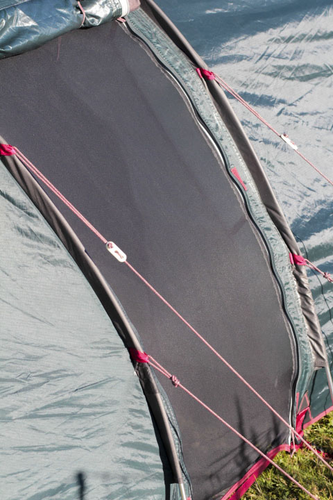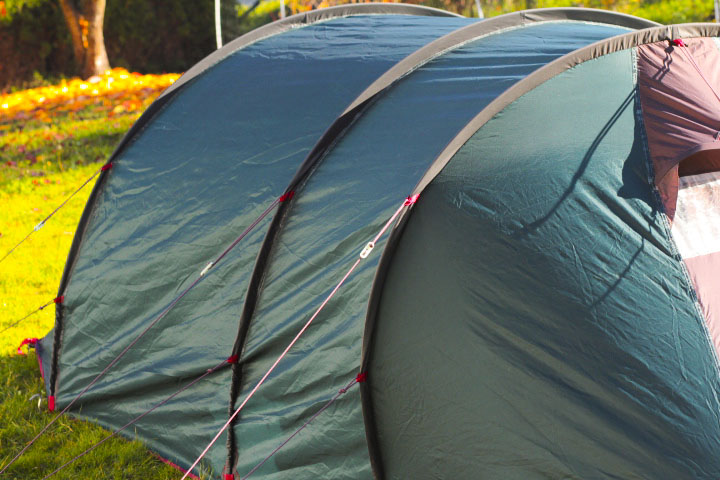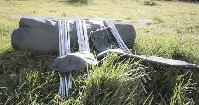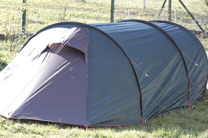 Der Aufbau ist in wenigen Minuten erledigt: Die 3 Segmentstangen zusammenstecken, durch die vorgesehenen Kanäle schieben und einhängen. Anschließend sind die Heringe zu befestigen. Und das wars auch schon.