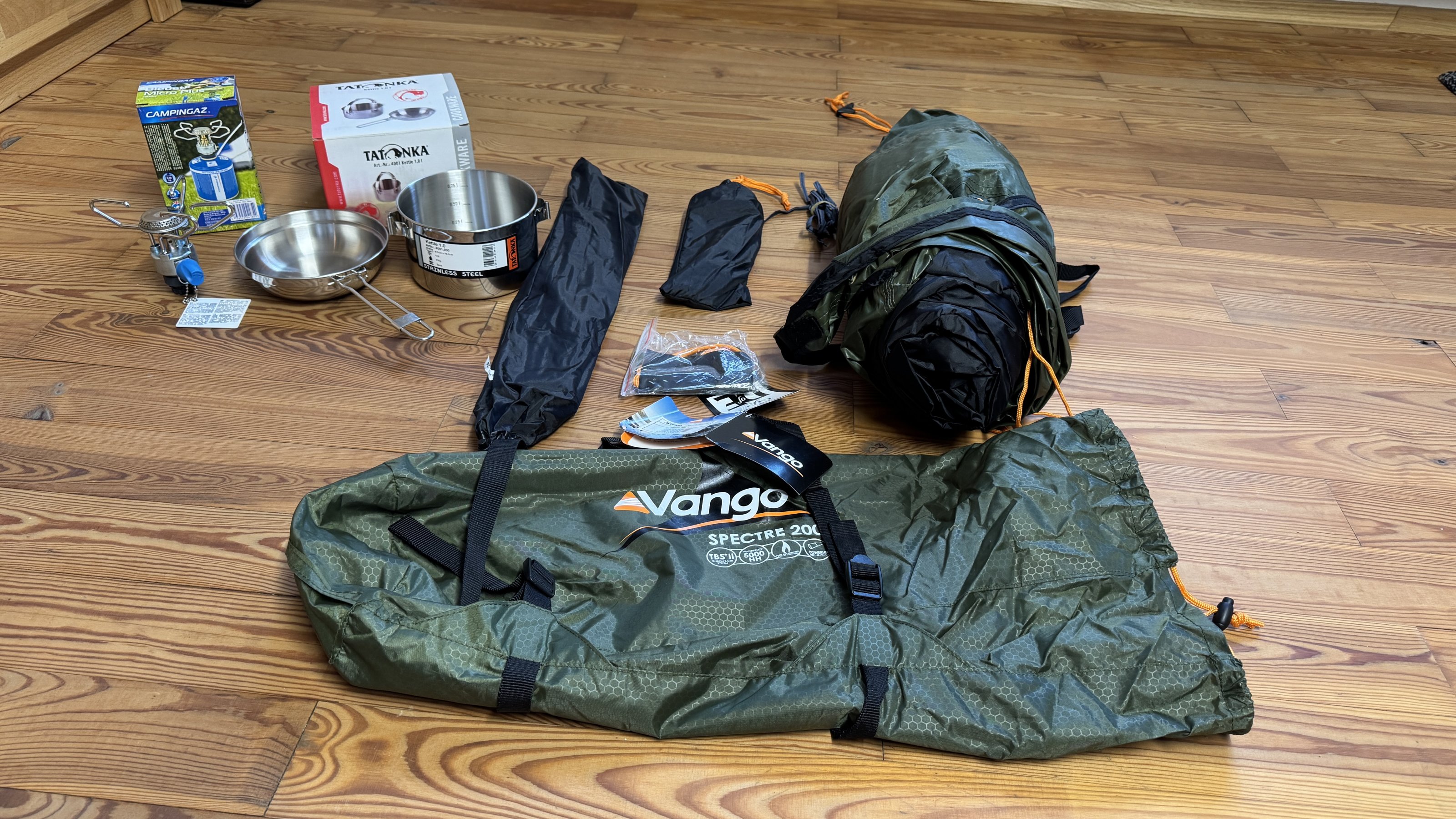 Biete hier ein Vango Spectre 200 Zelt. Nur 1x aufgestellt zum testen. Seit dem liegt es im Keller. Dazu noch (noch nie benutzt) ein kleiner Topf, eine kleine Pfanne und ein Gasbrenner.